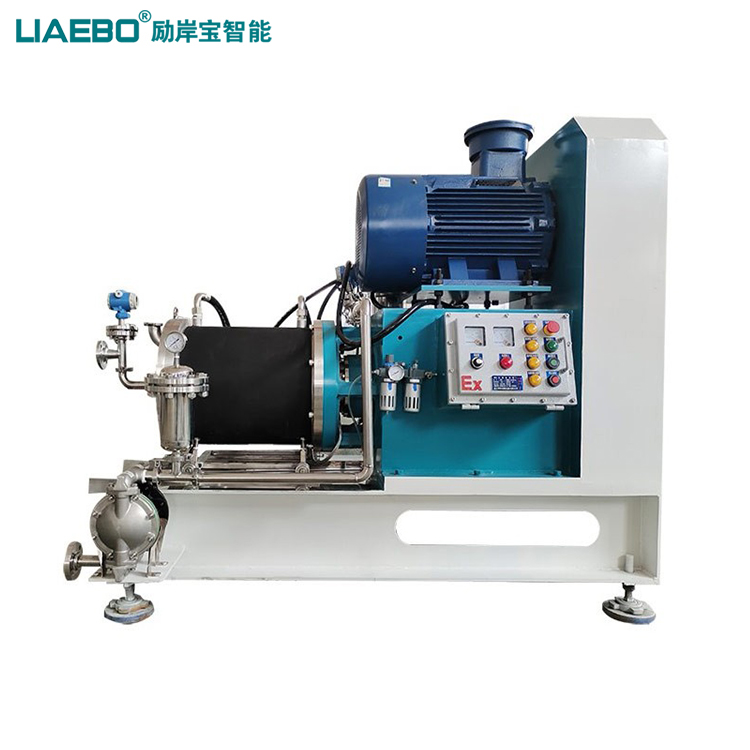 采用循環(huán)研磨工藝,環(huán)保節(jié)能、勞動(dòng)強(qiáng)度小。配制好的原始漿料,經(jīng)過第一遍粗略研磨后,泵入循環(huán)攪拌罐,經(jīng)底部泵輸送進(jìn)入納米研磨機(jī);一邊經(jīng)過研磨后送入循環(huán)罐,與未曾研磨過的物料通過攪拌機(jī)快速混亂,一邊又通過底部泵入砂磨機(jī),周而復(fù)始直到達(dá)成研磨要求。一般而言,罐的容積是砂磨機(jī)流量的1/4。采用循環(huán)研磨工藝或多次研磨工藝能使產(chǎn)能提高,產(chǎn)品顆粒級配分布得以優(yōu)化。稍加一些控制功能,可保證產(chǎn)品的可復(fù)制性及節(jié)省成本。大尺寸轉(zhuǎn)子加上筒狀縫隙式分離器,使該型設(shè)備可使用不同材質(zhì)小顆粒珠子。對于防金屬污染的物料,可采用陶瓷(碳氮化硅,氧化鋯)及聚氨酯結(jié)構(gòu)材料。