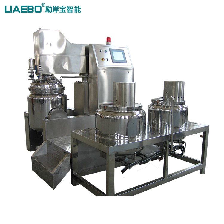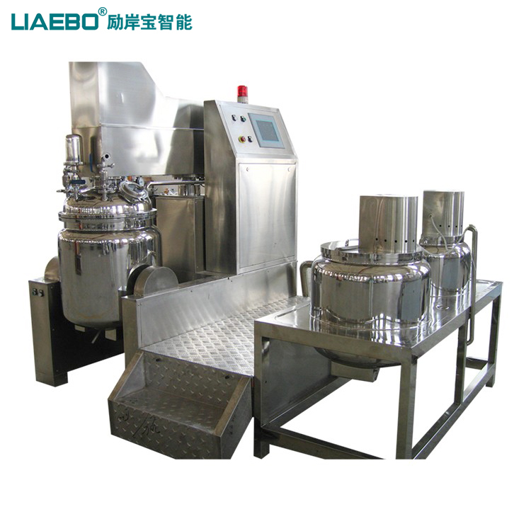 LZJR-150型真空均質(zhì)乳化機(jī)組分為主鍋、油鍋、水鍋、電器控制系統(tǒng)、真空系統(tǒng)以及機(jī)架等構(gòu)成部分。主鍋由均質(zhì)攪拌鍋、均質(zhì)機(jī)構(gòu)、攪拌機(jī)構(gòu)等部分組成。