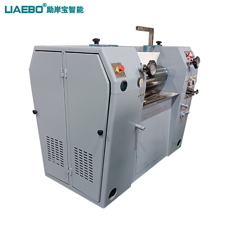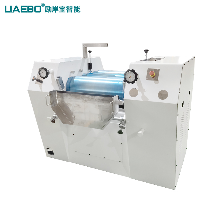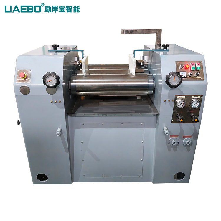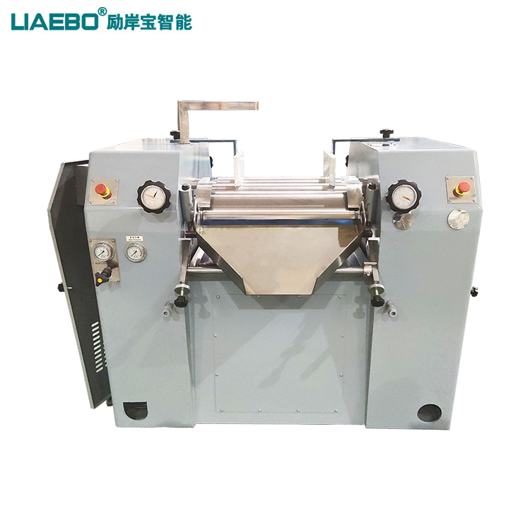 三輥研磨機主要用于各種油漆、油墨、顏料、塑料、食品等膏狀漿料之用,主要為油漆、油墨等高粘度物料的研磨分散之主要設(shè)備。該機通過機器水平方向排列的三根輥筒表面相互擠軋及不同的速度的摩擦而達到研磨作用,研磨物料一般只要研磨二次就可以達到要求,難研物料必須研磨多次,方能達到要求。工作時間快、慢輥調(diào)節(jié)到適當(dāng)位置,啟動機器,然后將需要研磨的漿料加入中輥與慢輥之間銅刀處,漿料經(jīng)過中、慢輥表面擠軋后,由中輥帶給快輥,再由緊貼表面的出料刮刀予以刮下,通過裝有欄板的刀板,流入盛料筒,由此構(gòu)成整個研磨的過程。
